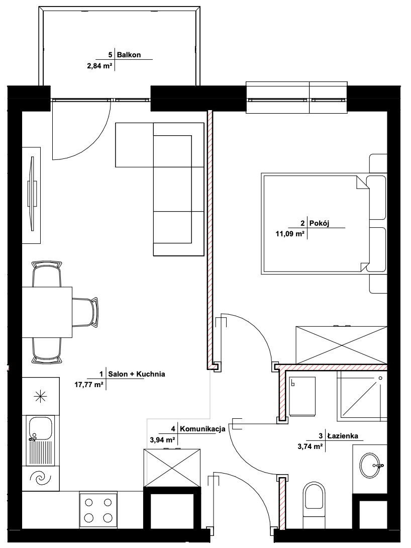 - salon + aneks kuchenny - 17,77 m2