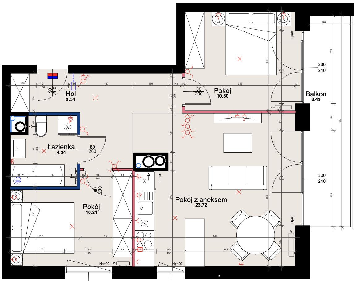 - pokój z aneksem kuchennym (możliwość wydzielenia) - 23,72 m2