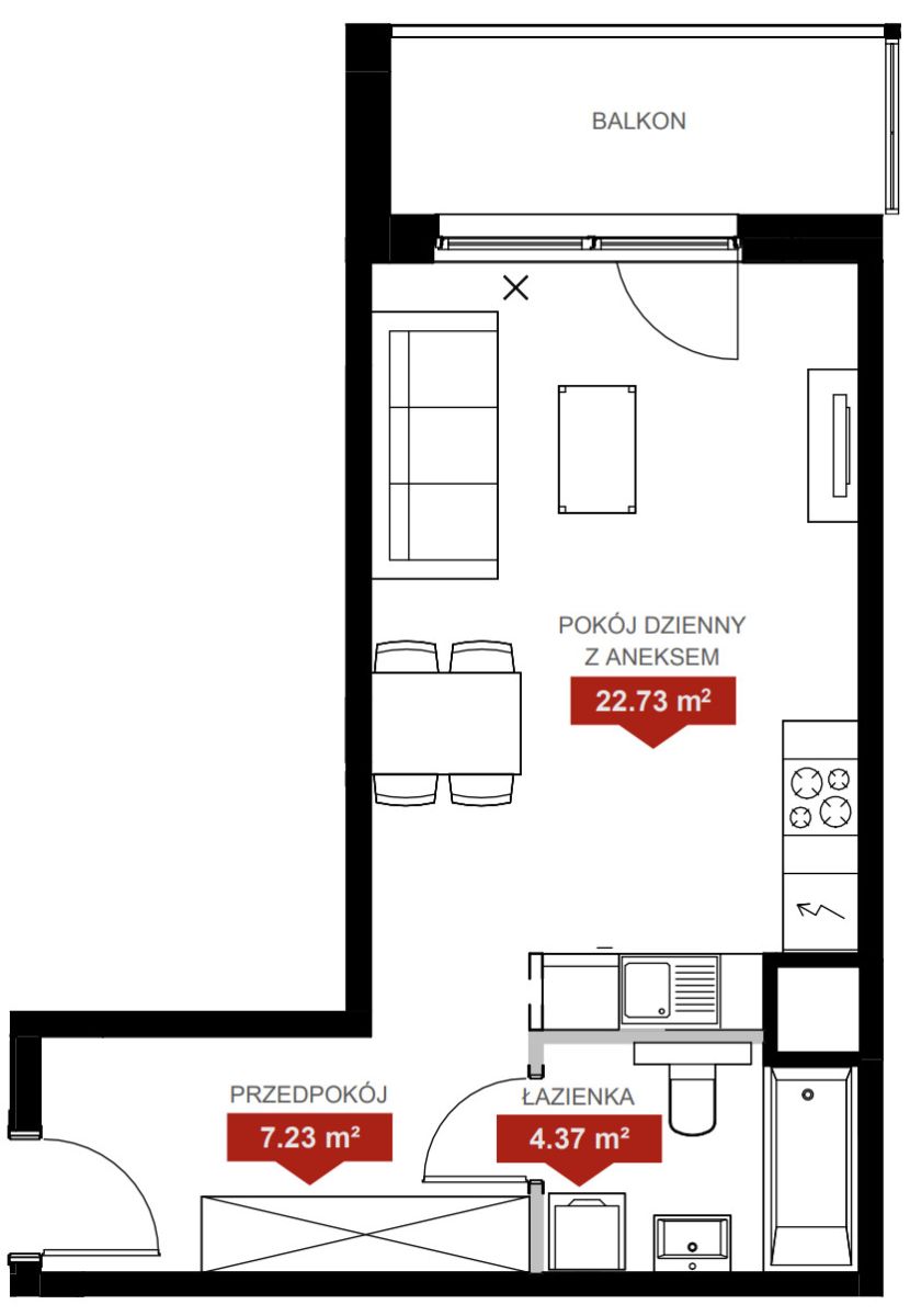 - pokój dzienny z aneksem kuchennym - 22,73 m2