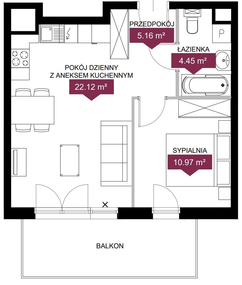 - salon + aneks kuchenny - 22,12 m2