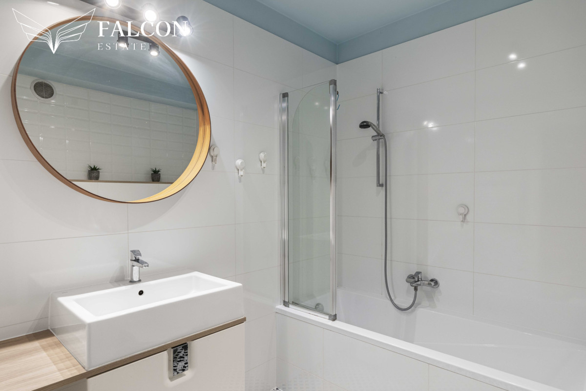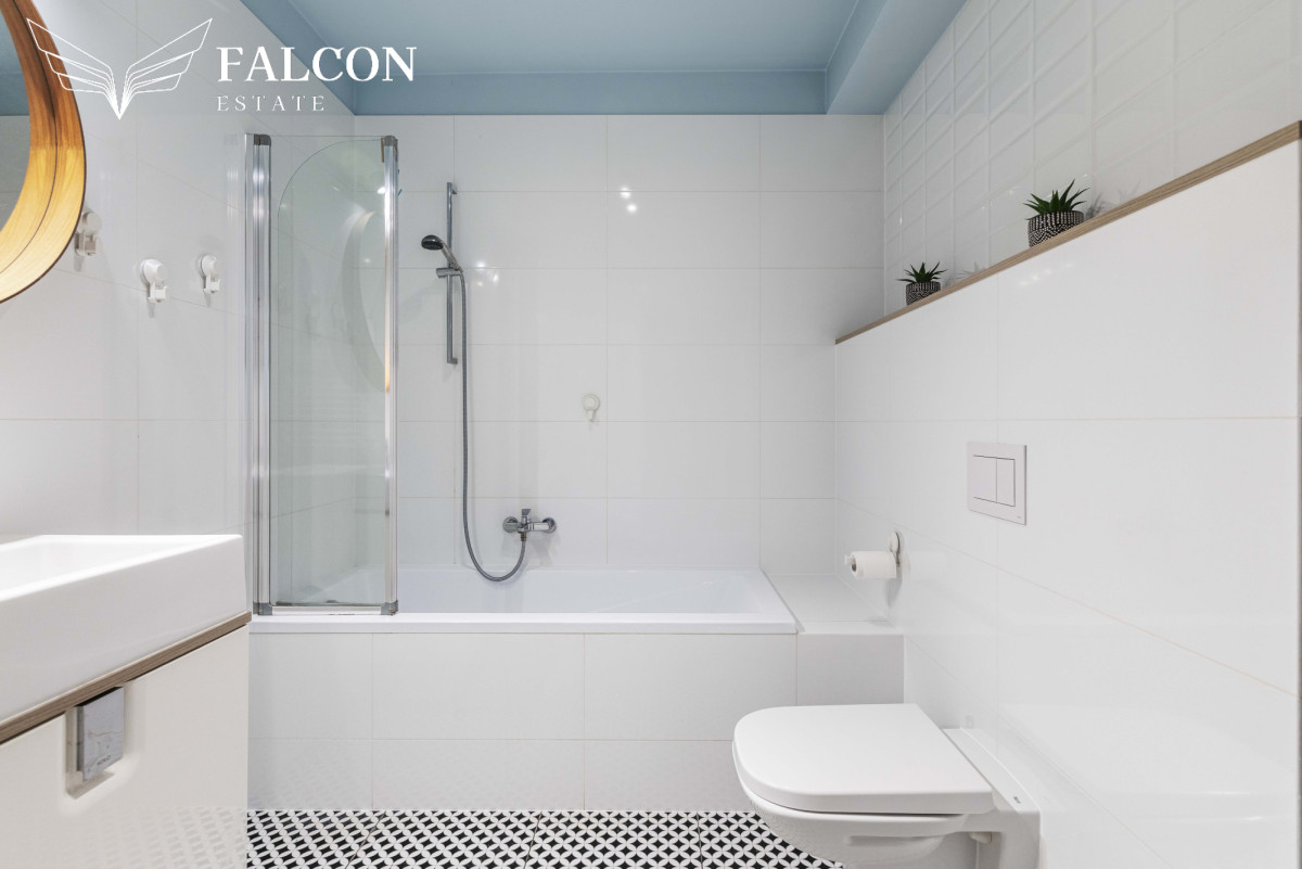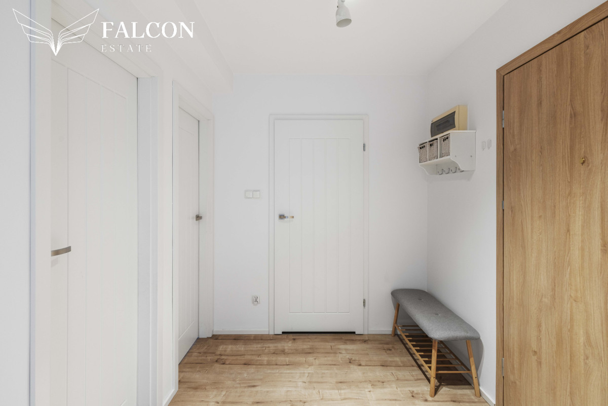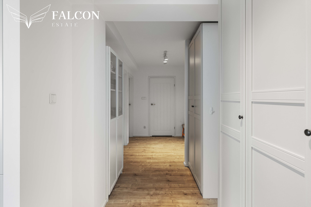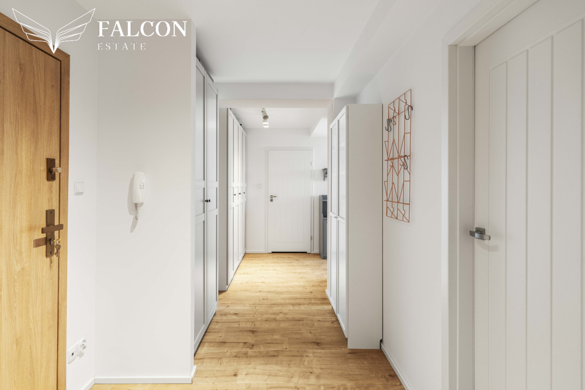 Lokal został wykończony 6 lat temu przez pracownię architektoniczną KODO - to pierwsze wykończenie od stanu deweloperskiego. Utrzymany jest w bardzo dobrym stanie technicznym i wizualnym - obecnie nie wymaga żadnych nakładów finansowych. Mieszkanie zaprojektowano z dbałością o każdy detal, a przestronny przedpokój został w pełni zabudowany pojemnymi szafami, dzięki czemu pełni funkcję praktycznej garderoby i pomaga utrzymać porządek w całym wnętrzu.